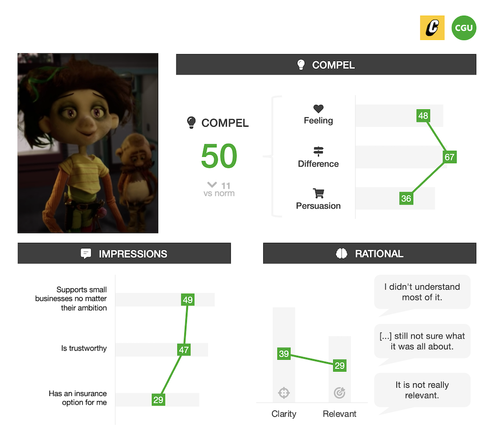 While some took away broad sentiment around bringing color into a dark and mundane world, and the triumphs of running a small business, by-and-large people failed to recognize the ad’s intent to advocate for “Tall Poppies” (or what a “Tall Poppy” was in the first place, and how they related to business success). Less than half of people agreed that CGU supported small businesses no matter their ambition, or that it was a caring brand. Lacking a clear story and meaningful role for the brand subsequently hindered relevance and diluted positivity toward CGU.