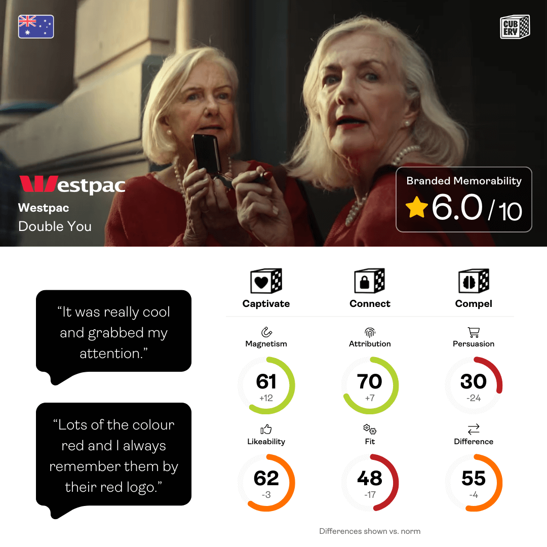 But while the play on words between “W” and “Double You” was broadly understood, some came unstuck as to exactly what the practical benefit of having a clone meant in a banking context. As a result, not everyone found what the ad was putting forward to be credible or relevant—with impressions of Westpac being a modern, trustworthy, and supportive bank not coming through as strongly as hoped.